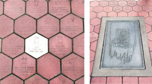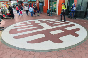 Ideograma de la doble felicidad. Abajo: Baldosas de la calle Capón, en las que los ciudadanos inscriben sus nombres.