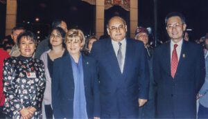 Presidente de APCH y Chen Zhili, ministra de Educación de China, en colocación de baldosa con su nombre. Derecha, Mai Guoyan, embajador de China en el Perú en el año 2000, y Luis Chang, embajador del Perú en China en el año 2002.