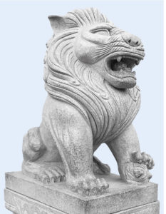 Escultura de león de Fu en el arco chino. Es un protector fiel que ahuyenta los espíritus negativos.