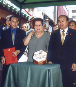 Martha Hildebrandt, presidenta del Congreso del Perú (1999-2000), en la calle Capón, donde se colocó su baldosa. La acompañan Emilio Wu y Luis Yong, directivos de APCH.