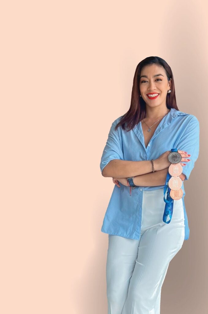 Sicóloga y coach organizacional y deportiva, es también instructora de natación y medallista en el XIII Sudamericano Máster Lima 2023.