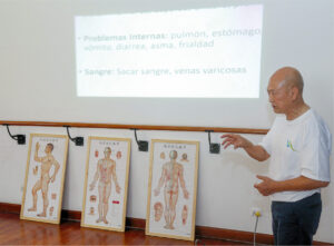 ¿La medicina china es útil para tratar cualquier enfermedad, aun las crónicas?, le preguntamos. “Sí, la medicina china puede ayudar al cuerpo humano a recobrar su funcionalidad y su habilidad para combatir diversos males, así como tratar la enfermedad en sí”, nos responde. “Este es el concepto básico de salud en la medicina china: 天 地 人 (Cielo-Tierra-Hombre). Siempre que estos tres elementos estén alineados y en buen orden, el cuerpo funcionará como está previsto”, afirma. Cuando la enfermedad se vuelve crónica, dice, es una indicación de que el cuerpo está débil y no puede combatirla. Así, los principios de tratamiento en la medicina china son: si la dolencia es aguda, hay que tratar los síntomas, como el dolor; pero cuando es crónica, debemos rastrear la fuente que crea el problema, ya sea en los órganos, en las desarmonías energéticas o en los desequilibrios del yin y el yang en alguna parte del cuerpo. La práctica del qigong –dice el doctor Chuy– es una de las mejores formas de lograr una buena salud y prevenir enfermedades. “Como sabemos, la mayoría de los problemas de salud son causados por deficiencias de circulación y oxigenación”, sostiene. “Mediante el uso de técnicas de respiración especiales (respiración abdominal), quien practica qigong puede mejorar la circulación sanguínea en todo el cuerpo, proporcionando abundante suministro de oxígeno a órganos, músculos, tendones y nervios, ayudándolos a trabajar de manera más eficiente”, añade. Además de la respiración profunda, hay otros dos principios que enarbola el qigong: la postura corporal y el control mental. Al dominar estos tres aspectos se puede disfrutar de una mejor salud y reducir las posibilidades de enfermarse física, mental y espiritualmente. Esta disciplina milenaria es estudiada científicamente desde hace 45 años, siendo tema de más de 500 ensayos clínicos y 120 revisiones sistemáticas sobre los beneficios para la salud del tai chi chuan, que es una forma de qigong en movimiento. El consenso científico señala que el qigong es beneficioso para la prevención de caídas, debilidad de miembros inferiores, osteoartritis, enfermedad pulmonar obstructiva, enfermedad de Parkinson, depresión, insomnio, demencia, rehabilitación cardíaca y de accidentes cerebrovasculares. Además, mejora la calidad de vida y la sensación de bienestar en pacientes que padecen cáncer, fibromialgia, hipertensión arterial y osteoporosis. “Por todo esto, la comunidad científica estimula a los médicos a recomendar esta excelente disciplina a sus pacientes”, concluye este médico chino de corazón peruano. Esperamos ansiosos su próxima visita a Lima.